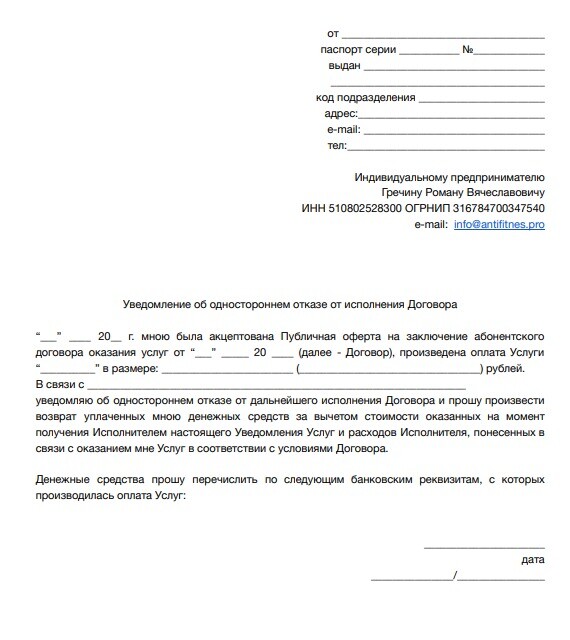 8.1. Претензии Заказчика по оказываемым Услугам принимаются Исполнителем к рассмотрению посредством электронной почты. Все претензии направляются Заказчиком с Адреса электронной почты Заказчика на адрес электронной почты Исполнителя: info@antifitnes.pro.